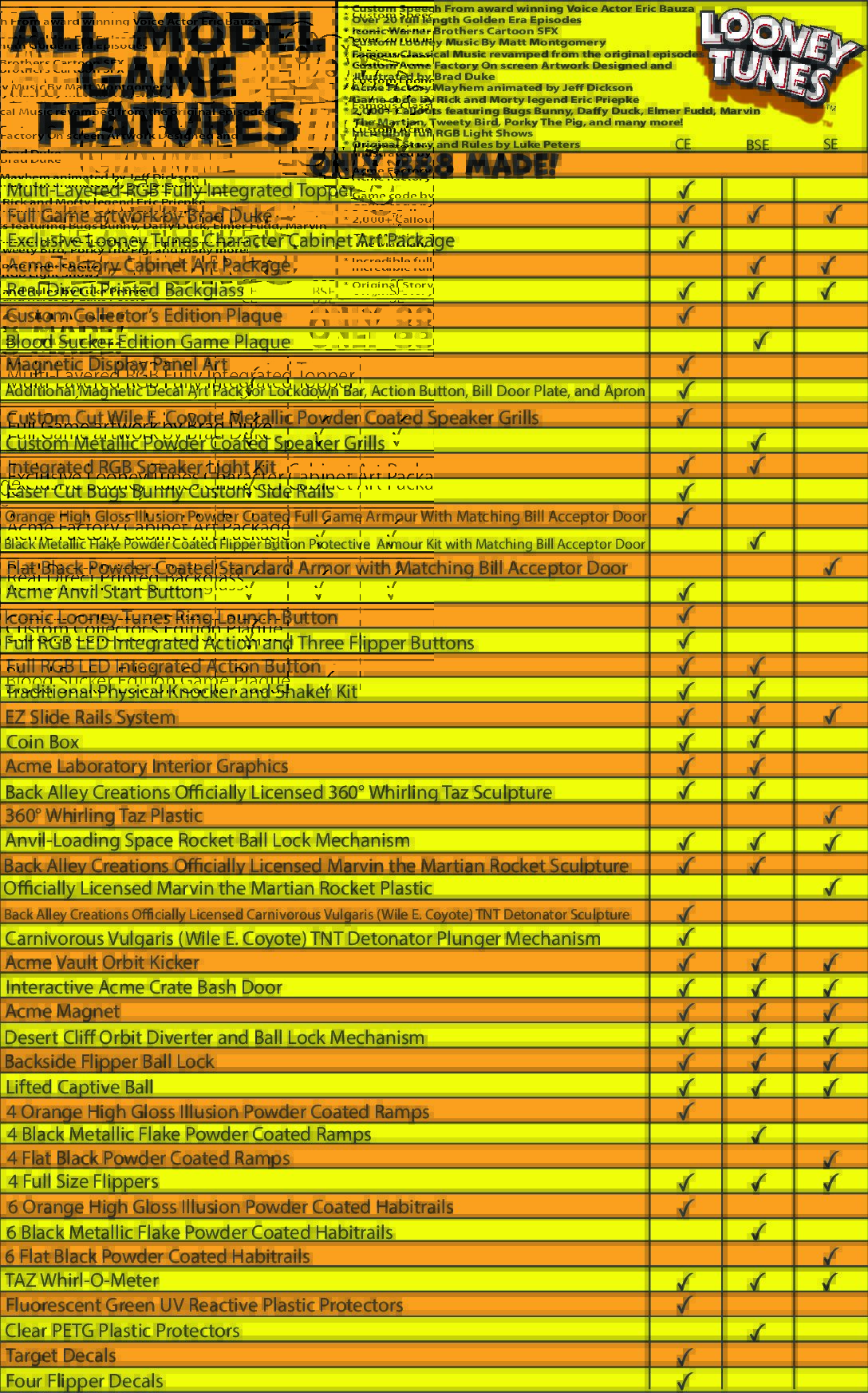 Looney Tunes is a standard body pinball machine set inside the Acme Factory where Bugs Bunny and Daffy Duck are helping lead their friends to collect film footage, and restore the factory recently destroyed by the Tasmanian Devil. This game features original Golden Era Looney Tunes Clips, and features the incredibly talented and official Looney Tunes Voice Actor Eric Bauza. It also features original Music by Matt Montgomery, Custom Sculpts from Back Alley Creations, Coded by Rick and Morty’s Eric Priepke, and story/rules by Luke Peters. It is the 3rd game designed by Spooky Luke and Corwin “Bug” Emery, and is certainly their best shooter yet. The game features a variety of major mechs, some of which being an interactive acme vault bash toy, and an Anvil Loading Space Rocket Ball Lock Mechanism. And with 4 ramps and repeatable looping shots, this game has more flow and combo potential than any Spooky game to date. If you grew up loving Looney Tunes as much as we did, or if you’re into Pinball with the best major mechanisms and flow, then enter the wacky world under glass of Looney Tunes Pinball. The Collector’s Edition is our highest tier package and will be built before all other packages.