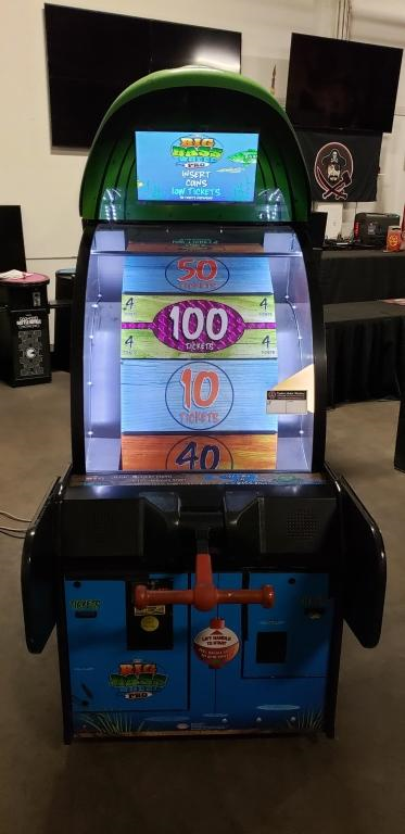 This is a BIG BASS WHEEL PRO Ticket Redemption Arcade Machine for sale. Black tape on handle. 3 in stock. They work and look great.