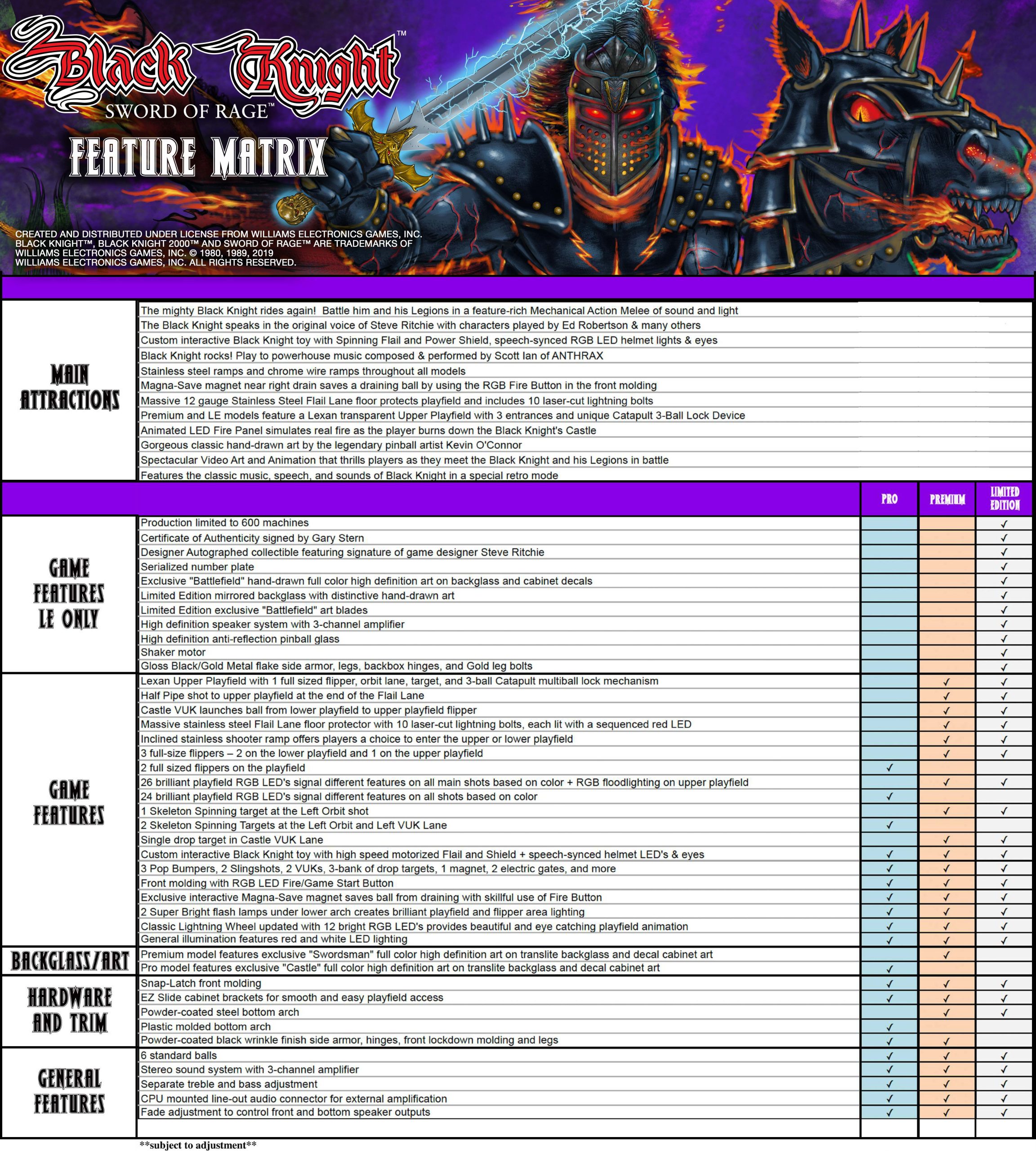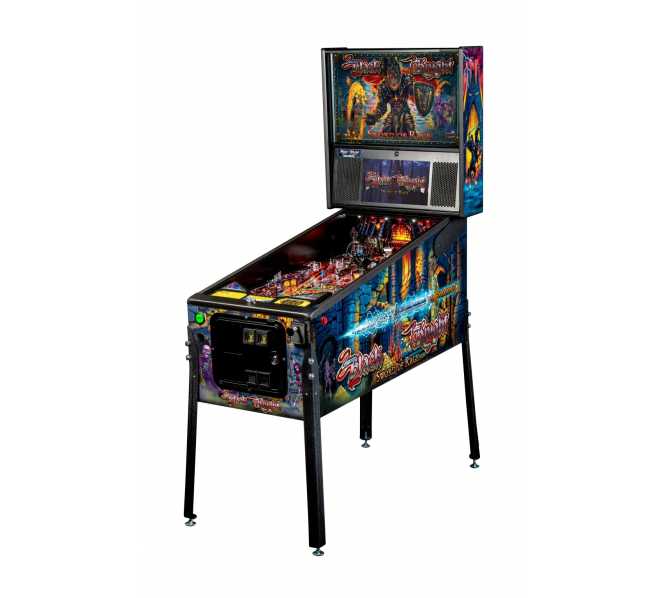 Stern’s Black Knight: Sword of Rage Pro featureS stunning and distinctive hand-drawn art in homage to this pinball icon. Navigating through these dark, mysterious, and twisted realms, players will uncover foes, demons, riches, and secrets in their quest against the Black Knight. Each game features a custom sculpted, interactive, and multi-functional Black Knight bash toy. This interactive Black Knight toy features a bi-directional motorized flail, a glowing RGB helmet with individually controllable expressive lighting to interact and taunt players with custom speech, and a sliding coil-driven shield that will bash and block your shots.