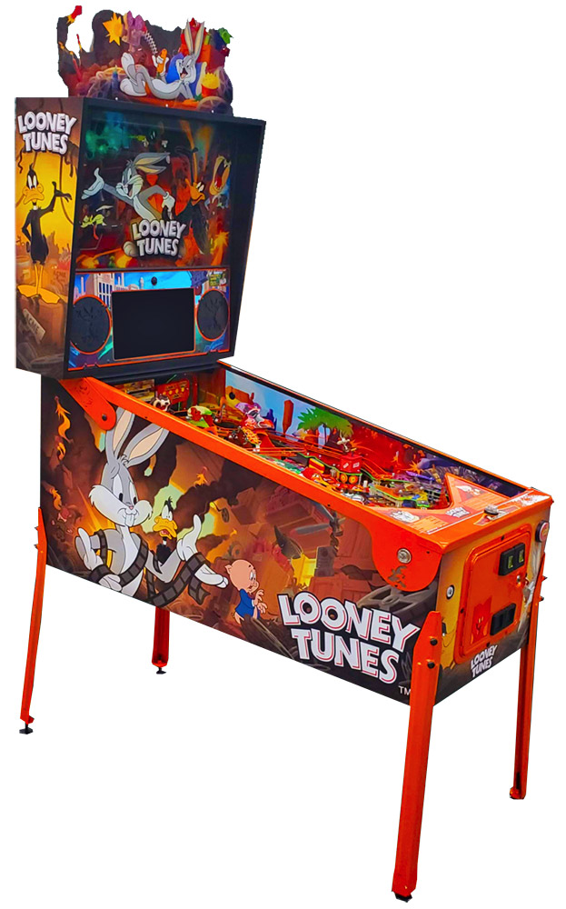 Looney Tunes is a standard body pinball machine set inside the Acme Factory where Bugs Bunny and Daffy Duck are helping lead their friends to collect film footage, and restore the factory recently destroyed by the Tasmanian Devil. This game features original Golden Era Looney Tunes Clips, and features the incredibly talented and official Looney Tunes Voice Actor Eric Bauza. The game features a variety of major mechs, some of which being an interactive acme vault bash toy, and an Anvil Loading Space Rocket Ball Lock Mechanism. And with 4 ramps and repeatable looping shots, this game has more flow and combo potential than any Spooky game to date.