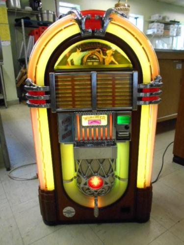 This is a WURLITZER PLAY IT AGAIN MINI JUKEBOX – RADIO & CD PLAYER – with ROTATING COLOR COLUMNS WORKS GREAT!